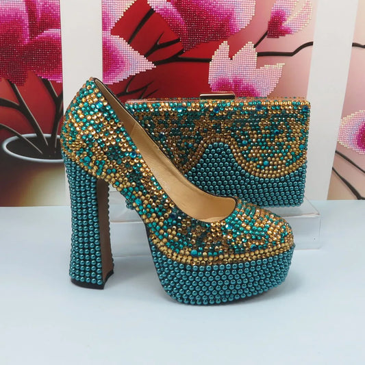 Fashion Teal Blue Mix Color Wedding Shoes and bag Set Woman 14CM High Pumps Thick Heel Party Shoes Matching Bag Round Toe Pumps