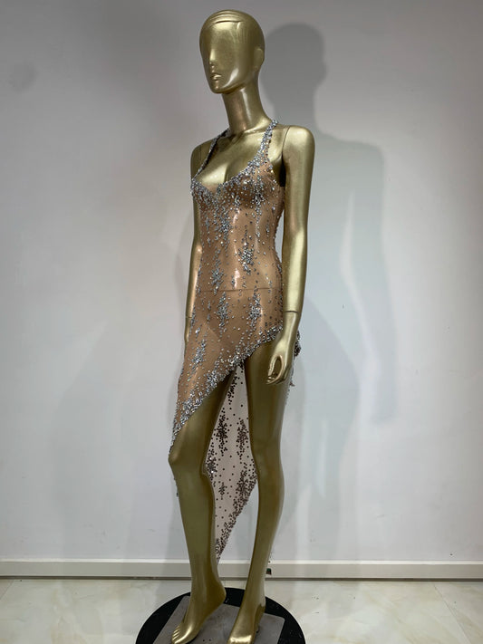 Stock Sparkly Rhinestone Evening Dress Women Celebrity Birthday Wear Sexy See Through Mesh Photo Shoot Stage performance Costume