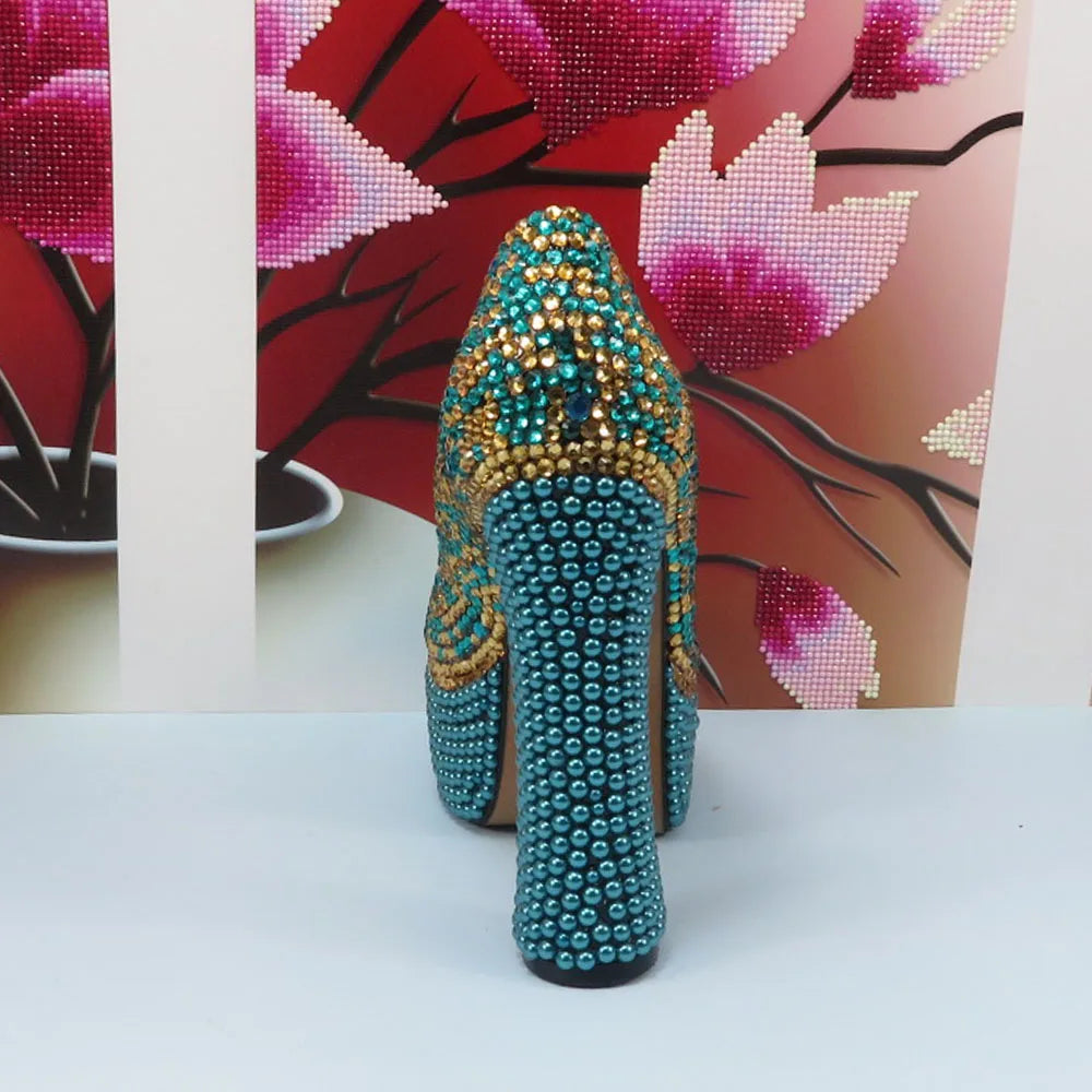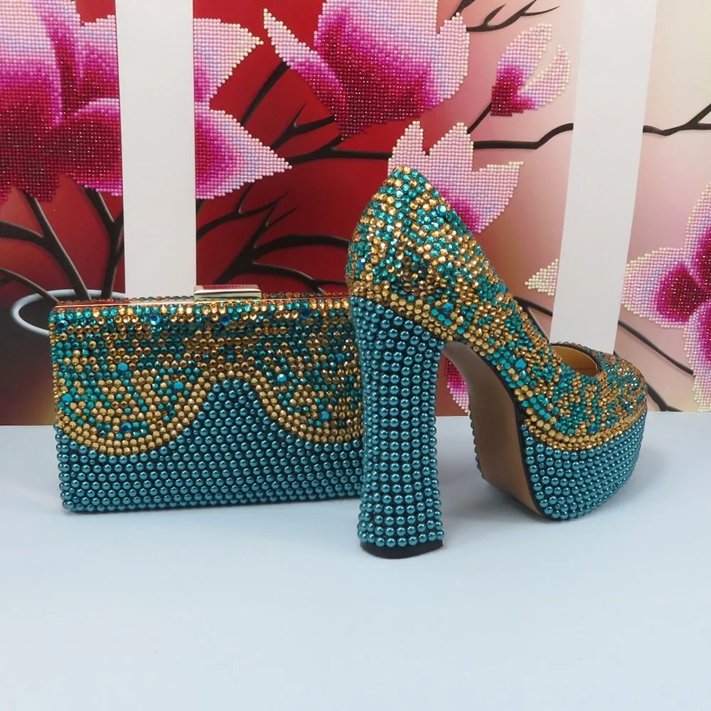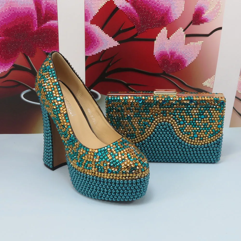 Fashion Teal Blue Mix Color Wedding Shoes and bag Set Woman 14CM High Pumps Thick Heel Party Shoes Matching Bag Round Toe Pumps
